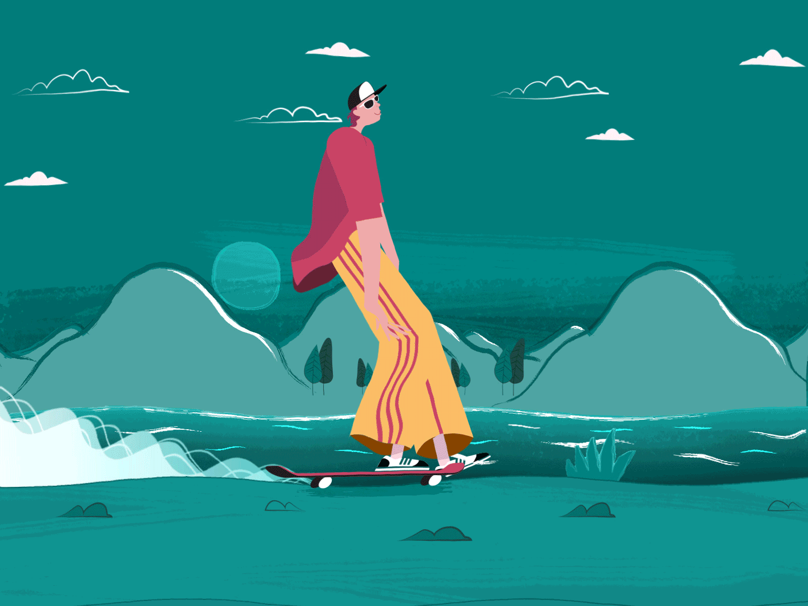 Next up in my series of character rigs is this funky skater kid. The limbs are rigged w/ rubber hose and the rest of the body is made w/ shape layers parented up to the torso. This process is a bit easier then a full duik rig, but also has less controls. I like the ease of moving the limbs this way, and it's easy to customize your character on the fly. The background is drawn in illustrator and pushed to After Effects as shape layers.